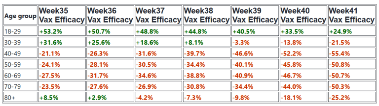 Ha a beoltottak esetszámai egyszerűen konvergálnának és találkoznának a be nem oltottak esetszámaival, akkor a vakcina egyszerűen elveszítené hatékonyságát és a táblázatok mind zöldek lennének, a vakcina hatékonysága pedig NULLA lenne.De nem ez történt meg!A beoltott esetszámok most kétszeresei a be nem oltott esetszámoknak 100 ezer emberre vetítve és a táblázatok mind pirosak lettek.
